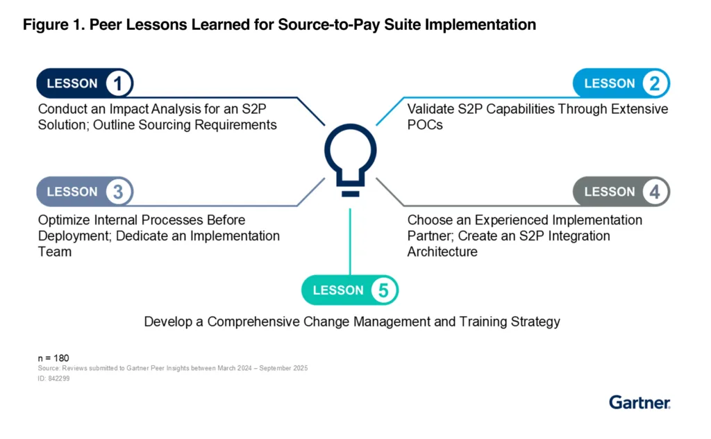 Gartner, Peer Lessons Learned for Source-to-Pay Suite Implementation, By Peer Community Contributor, 30 October 2025. Gartner is a trademark of Gartner, Inc and/or its affiliates.