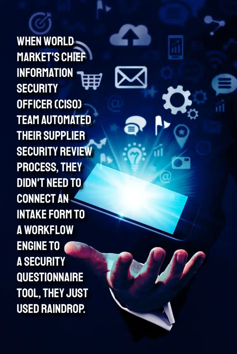 Real orchestration connects every part of your Procurement process automatically. When World Market receives a sourcing request through Raindrop, the system doesn’t just route it to Procurement. It simultaneously pulls in multiple different subject matter expert groups — Tax, Privacy, Insurance, Legal, Finance, and others — based on the request type, dollar amount, and business context. No manual coordination. No email chains. The workflow logic handles it.