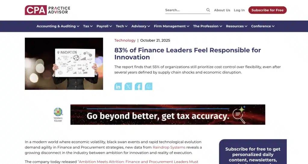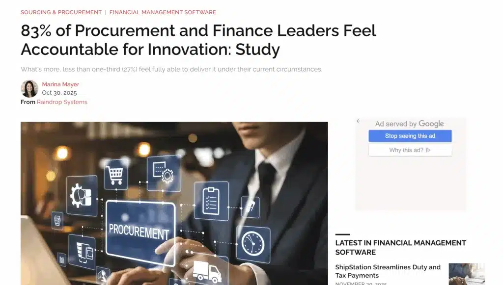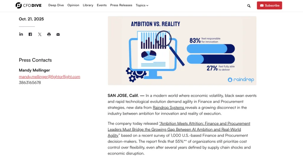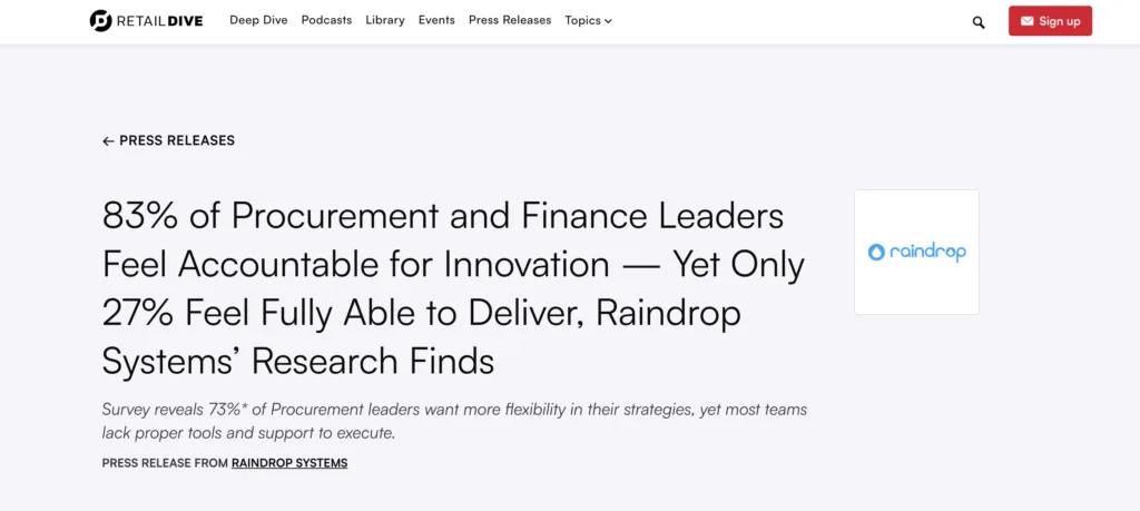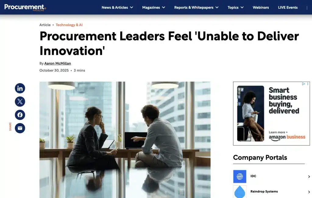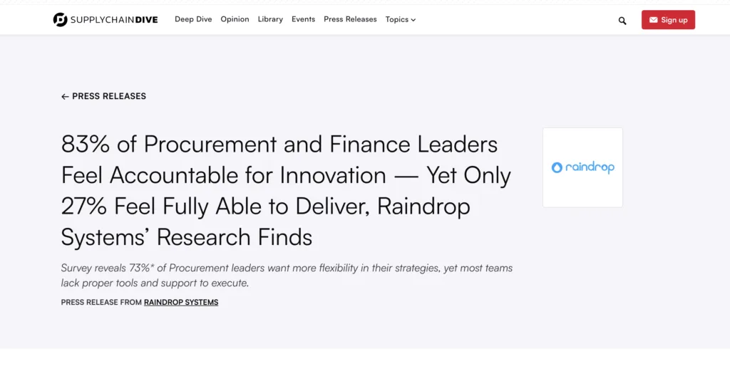 CFO Dive recently featured insights from Raindrop’s latest research, revealing that while 83% of Procurement and Finance leaders feel responsible for driving innovation, many organizations still struggle to align agility with cost efficiency.