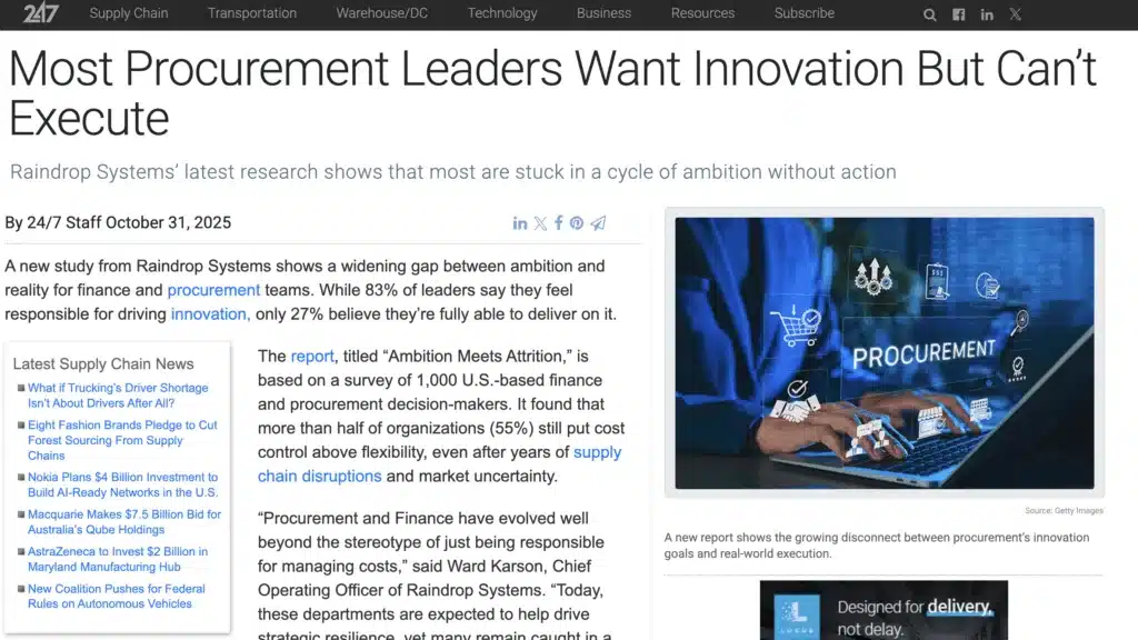 Supply Chain Digital recently featured insights from Raindrop’s latest research, revealing that while 83% of procurement and finance leaders feel responsible for driving innovation, many organizations still struggle to align agility with cost efficiency.