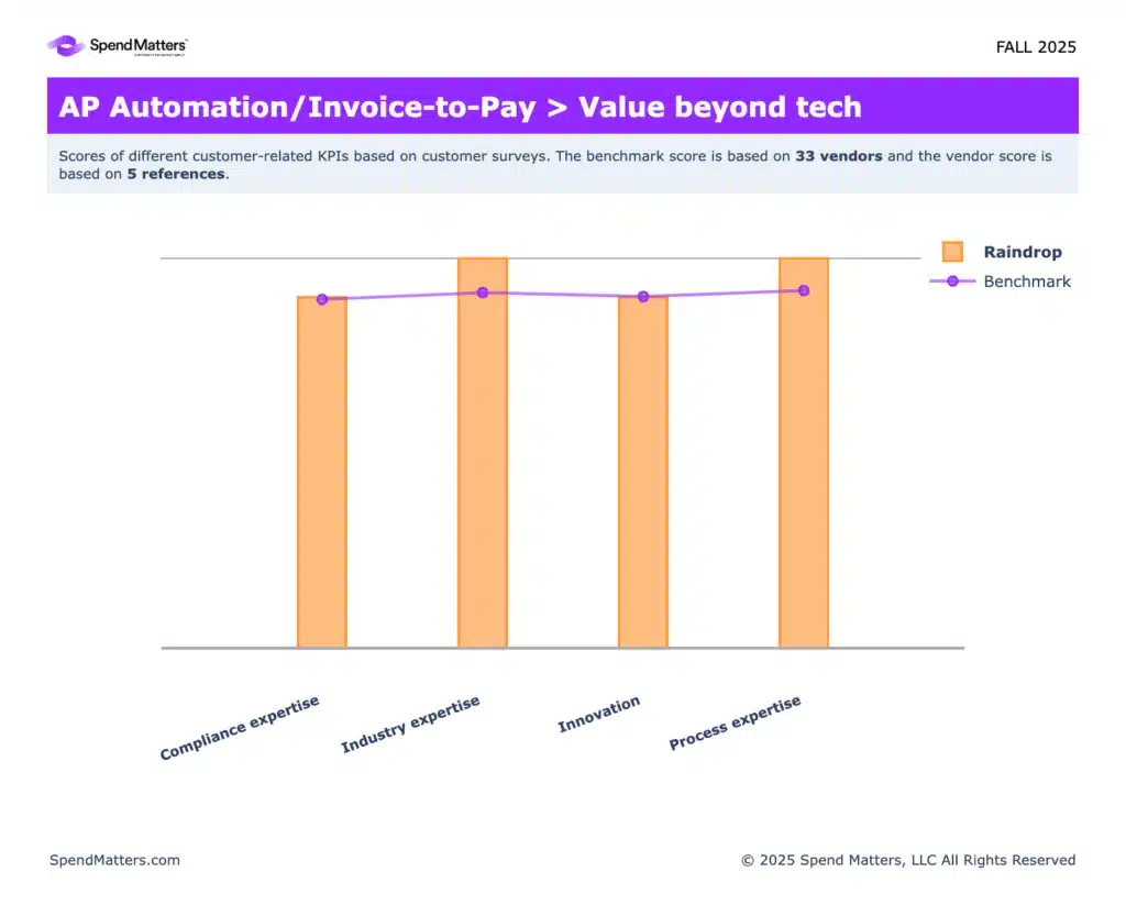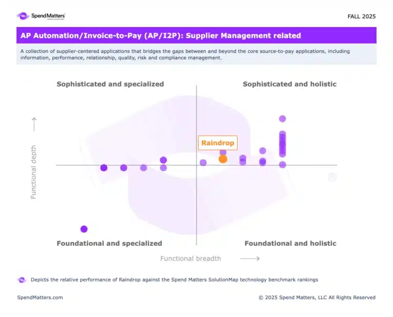 Our customers had a lot to say when it came to rating Raindrop solutions for the Spend Matters Fall 2025 SolutionMap. Participants, like Raindrop, are scored on technical capability and customer ratings; we think the results speak for themselves.