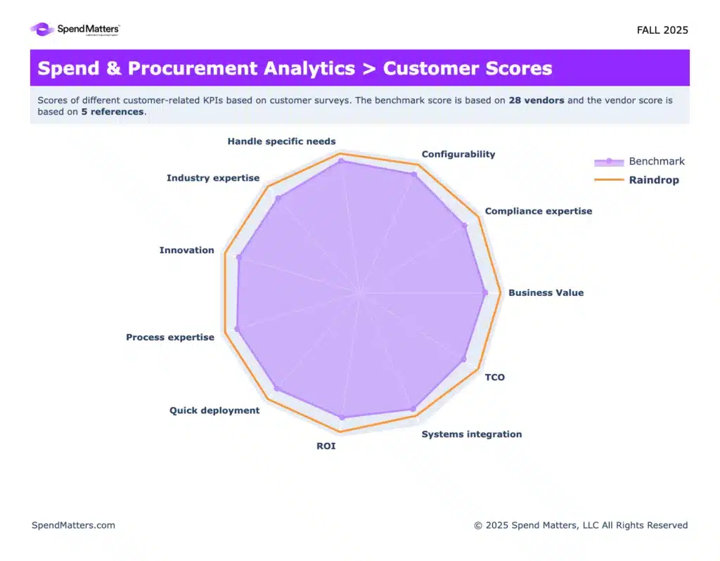 Our customers had a lot to say when it came to rating Raindrop solutions for the Spend Matters Fall 2025 SolutionMap. Participants, like Raindrop, are scored on technical capability and customer ratings; we think the results speak for themselves.